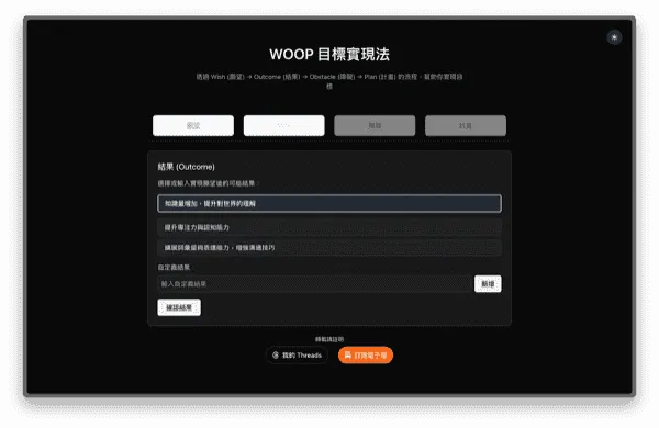 運用心理學 WOOP 理論,透過 AI 協助將願望拆解成具體行動路徑,幫助你攻克拖延,實現目標。